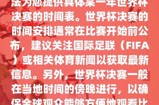 摘要:本文指出无法提供具体某一年世界杯决赛的时间表,建议读者关注国际足联或相关体育新闻以获取最新信息。世界杯决赛通常在当地时间的傍晚进行,以确保全球观众能够方便地观看比赛。具体决赛时间安排在比赛开始前公布。