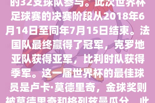 摘要:2018年俄罗斯世界杯是第21届足球赛事,全球32支球队参与。法国队赢得冠军,克罗地亚和比利时分别获得亚军和季军。最佳球员为卢卡·莫德里奇,金球奖被莫德里奇和格列兹曼分享。该届世界杯创造了多项纪录和亮点,观众人数创新高。