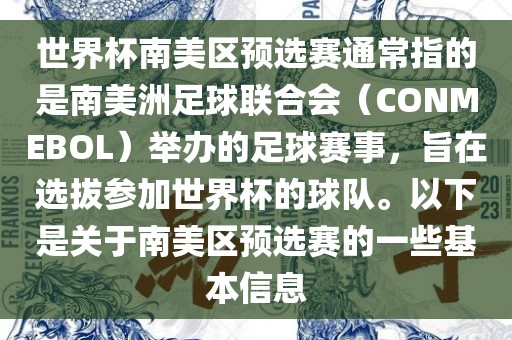 世界杯南美区预选赛通常指的是南美洲足球联合会(CONMEBOL)举办的足球赛事,旨在选拔参加世界杯的球队。以下是关于南美区预选赛的一些基本信息