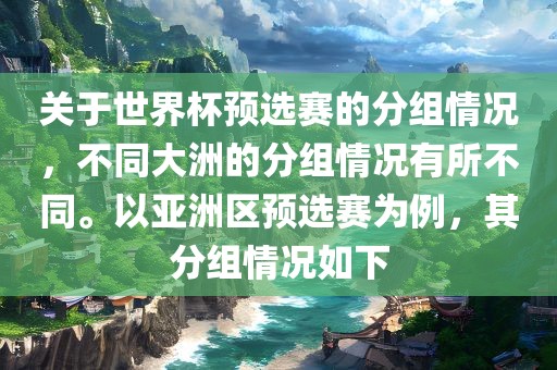 关于世界杯预选赛的分组情况,不同大洲的分组情况有所不同。以亚洲区预选赛为例,其分组情况如下