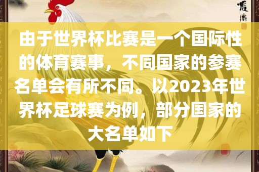 由于世界杯比赛是一个国际性的体育赛事,不同国家的参赛名单会有所不同。以2023年世界杯足球赛为例,部分国家的大名单如下