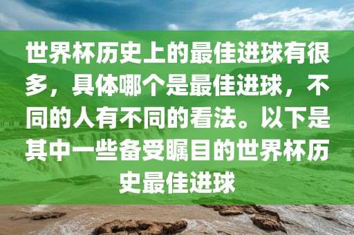 关于世界杯历史最佳进球,众说纷纭。以下是备受瞩目的几个进球简介:,,在世界杯的历史长河中,众多精彩进球留下了难以磨灭的印象。每个球迷心中都有自己心目中的最佳进球,而一些标志性进球如阿根廷球星迭戈·马拉多纳的“世纪进球”、英格兰球员加里·莱因克尔的远距离射门等,都成为了世界杯历史上的经典瞬间。这些进球以其独特的方式和震撼力,被永远铭记在足球史册中。
