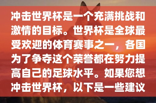 冲击世界杯是一个充满挑战和激情的目标。世界杯是全球最受欢迎的体育赛事之一,各国为了争夺这个荣誉都在努力提高自己的足球水平。如果您想冲击世界杯,以下是一些建议