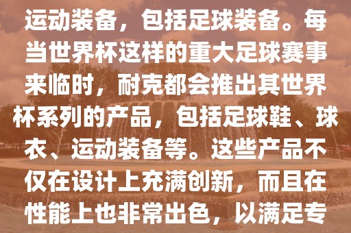 耐克(Nike)是全球著名的运动品牌,其产品线涵盖了各种运动装备,包括足球装备。每当世界杯这样的重大足球赛事来临时,耐克都会推出其世界杯系列的产品,包括足球鞋、球衣、运动装备等。这些产品不仅在设计上充满创新,而且在性能上也非常出色,以满足专业运动员和广大足球爱好者的需求。