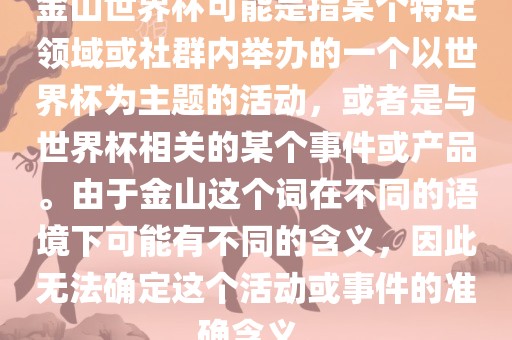 金山世界杯可能是指某个特定领域或社群内举办的一个以世界杯为主题的活动,或者是与世界杯相关的某个事件或产品。由于金山这个词在不同的语境下可能有不同的含义,因此无法确定这个活动或事件的准确含义。
