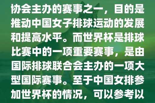 中国女子排球联赛是中国排球协会主办的赛事之一,目的是推动中国女子排球运动的发展和提高水平。而世界杯是排球比赛中的一项重要赛事,是由国际排球联合会主办的一项大型国际赛事。至于中国女排参加世界杯的情况,可以参考以下信息