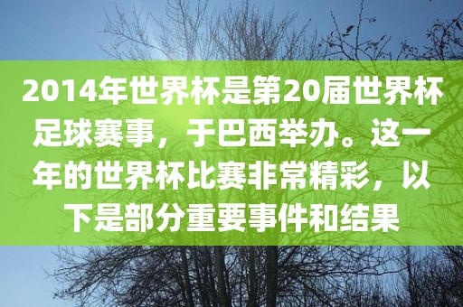 2014年世界杯是第20届世界杯足球赛事,于巴西举办。这一年的世界杯比赛非常精彩,以下是部分重要事件和结果