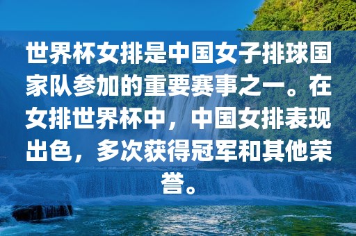 中国女排是一支实力强大、备受关注的队伍,在世界杯女排比赛中也有着非常出色的表现。