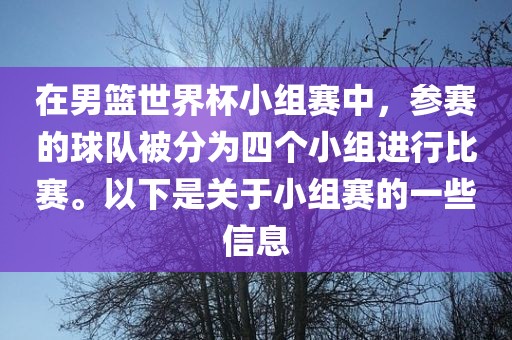在男篮世界杯小组赛中,参赛的球队被分为四个小组进行比赛。以下是关于小组赛的一些信息