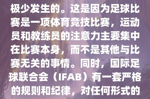 在世界杯足球比赛中,打架事件极为罕见。这是因为足球比赛的核心是竞技,运动员和教练员的关注点在比赛本身,而非其他杂事。国际足球联合会实施严格的规则和纪律,对暴力行为采取零容忍政策,并会进行严厉处罚。这使得足球比赛保持公正、公平的环境。