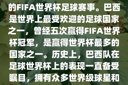 巴西足球世界杯是指巴西举办的FIFA世界杯足球赛事。巴西是世界上最受欢迎的足球国家之一,曾经五次赢得FIFA世界杯冠军,是赢得世界杯最多的国家之一。历史上,巴西队在足球世界杯上的表现一直备受瞩目,拥有众多世界级球星和精彩比赛瞬间。