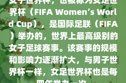 女子世界杯,也被称为女足世界杯(FIFA Women’s World Cup),是国际足联(FIFA)举办的,世界上最高级别的女子足球赛事。该赛事的规模和影响力逐渐扩大,与男子世界杯一样,女足世界杯也是每四年举办一次。