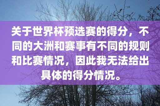 关于世界杯预选赛的得分,不同的大洲和赛事有不同的规则和比赛情况,因此我无法给出具体的得分情况。
