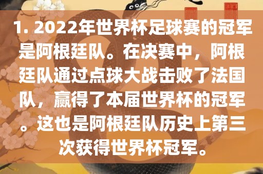 • 转载请注明来自金炬实业股份有限公司,本文标题:《1. 2022年世界杯足球赛的冠军是阿根廷队。在决赛中,阿根廷队通过点球大战击败了法国队,赢得了本届世界杯的冠军。这也是阿根廷队历史上第三次获得世界杯冠军?!?/a>