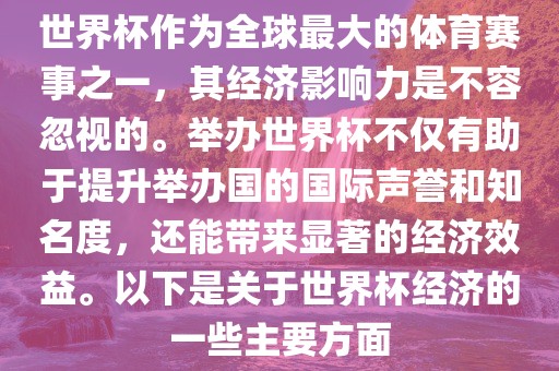 世界杯作为全球最大的体育赛事之一,其经济影响力是不容忽视的。举办世界杯不仅有助于提升举办国的国际声誉和知名度,还能带来显著的经济效益。以下是关于世界杯经济的一些主要方面
