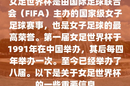 女足世界杯是由国际足球联合会(FIFA)主办的国家级女子足球赛事,也是女子足球的最高荣誉。第一届女足世界杯于1991年在中国举办,其后每四年举办一次。至今已经举办了八届。以下是关于女足世界杯的一些重要信息