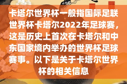 卡塔尔世界杯一般指国际足联世界杯卡塔尔2022年足球赛,这是历史上首次在卡塔尔和中东国家境内举办的世界杯足球赛事。以下是关于卡塔尔世界杯的相关信息