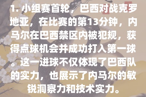 1. 小组赛首轮,巴西对战克罗地亚,在比赛的第13分钟,内马尔在巴西禁区内被犯规,获得点球机会并成功打入第一球。这一进球不仅体现了巴西队的实力,也展示了内马尔的敏锐洞察力和技术实力。