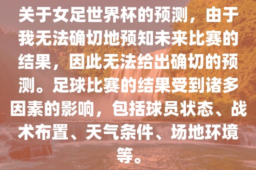 关于女足世界杯的预测,由于我无法确切地预知未来比赛的结果,因此无法给出确切的预测。足球比赛的结果受到诸多因素的影响,包括球员状态、战术布置、天气条件、场地环境等。