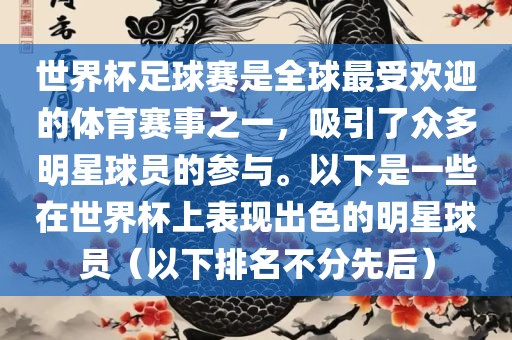 世界杯足球赛是全球最受欢迎的体育赛事之一,吸引了众多明星球员的参与。以下是一些在世界杯上表现出色的明星球员(以下排名不分先后)