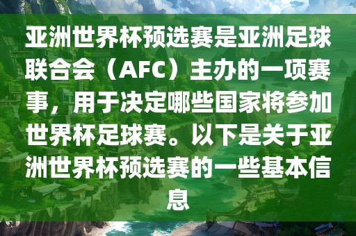 亚洲世界杯预选赛是亚洲足球联合会(AFC)主办的一项赛事,用于决定哪些国家将参加世界杯足球赛。以下是关于亚洲世界杯预选赛的一些基本信息