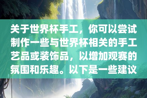 关于世界杯手工,你可以尝试制作一些与世界杯相关的手工艺品或装饰品,以增加观赛的氛围和乐趣。以下是一些建议