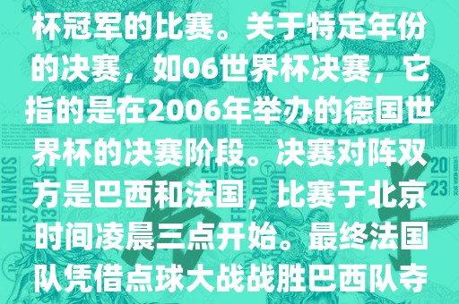 在世界杯历史上,决赛一般指的是小组赛后的最后一场比赛,决定哪支队伍能够赢得世界杯冠军的比赛。关于特定年份的决赛,如06世界杯决赛,它指的是在2006年举办的德国世界杯的决赛阶段。决赛对阵双方是巴西和法国,比赛于北京时间凌晨三点开始。最终法国队凭借点球大战战胜巴西队夺得冠军。如需更多信息,可以关注FIFA官网发布的世界杯决赛相关内容。