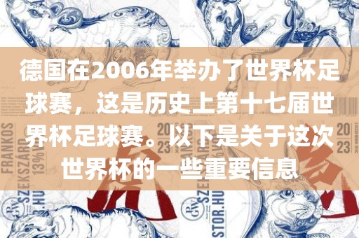 德国在2006年举办了世界杯足球赛,这是历史上第十七届世界杯足球赛。以下是关于这次世界杯的一些重要信息