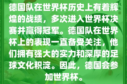德国队在世界杯历史上有着辉煌的战绩,多次进入世界杯决赛并赢得冠军。德国队在世界杯上的表现一直备受关注,他们拥有强大的实力和深厚的足球文化积淀。因此,德国会参加世界杯。