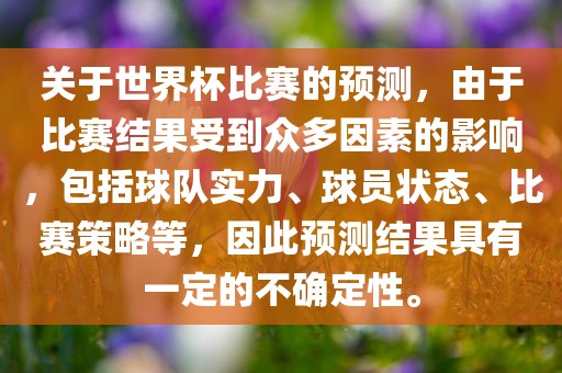 关于世界杯比赛的预测,由于比赛结果受到众多因素的影响,包括球队实力、球员状态、比赛策略等,因此预测结果具有一定的不确定性。