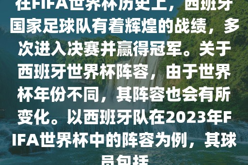 在FIFA世界杯历史上,西班牙国家足球队有着辉煌的战绩,多次进入决赛并赢得冠军。关于西班牙世界杯阵容,由于世界杯年份不同,其阵容也会有所变化。以西班牙队在2023年FIFA世界杯中的阵容为例,其球员包括