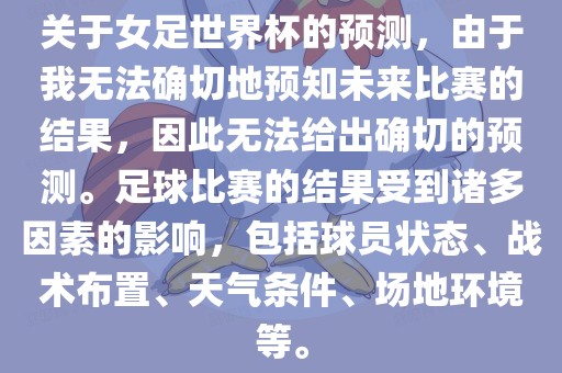 关于女足世界杯的预测,由于我无法确切地预知未来比赛的结果,因此无法给出确切的预测。足球比赛的结果受到诸多因素的影响,包括球员状态、战术布置、天气条件、场地环境等。