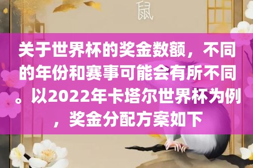 关于世界杯的奖金数额,不同的年份和赛事可能会有所不同。以2022年卡塔尔世界杯为例,奖金分配方案如下