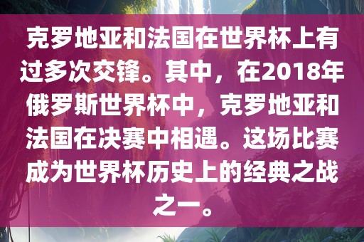 克罗地亚和法国在世界杯上有过多次交锋。其中,在2018年俄罗斯世界杯中,克罗地亚和法国在决赛中相遇。这场比赛成为世界杯历史上的经典之战之一。