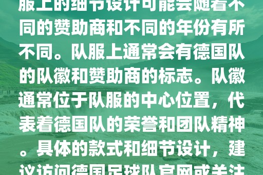 德国队在世界杯期间的队服以白色和黑色为主,细节设计随赞助商和年份变化。队徽位于中心,代表荣誉和团队精神。队服上还可能带有赞助商标志。若想获取最新信息和款式细节,可访问德国足球队官网或关注体育新闻。