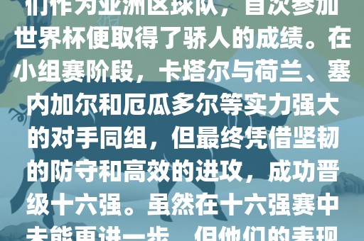 关于卡塔尔在2022年世界杯的表现,可以说是非常出色的。他们作为亚洲区球队,首次参加世界杯便取得了骄人的成绩。在小组赛阶段,卡塔尔与荷兰、塞内加尔和厄瓜多尔等实力强大的对手同组,但最终凭借坚韧的防守和高效的进攻,成功晋级十六强。虽然在十六强赛中未能更进一步,但他们的表现已经赢得了球迷和对手的尊重。