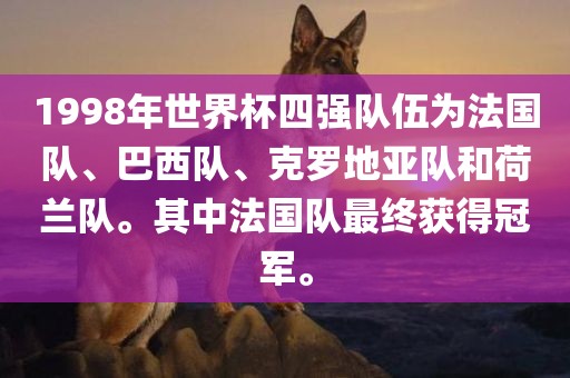 1998年世界杯四强队伍为法国队、巴西队、克罗地亚队和荷兰队。其中法国队最终获得冠军。