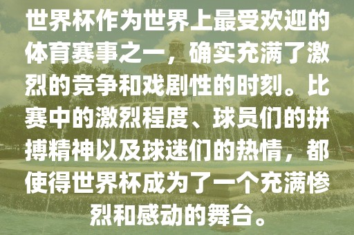 世界杯作为世界上最受欢迎的体育赛事之一,确实充满了激烈的竞争和戏剧性的时刻。比赛中的激烈程度、球员们的拼搏精神以及球迷们的热情,都使得世界杯成为了一个充满惨烈和感动的舞台。