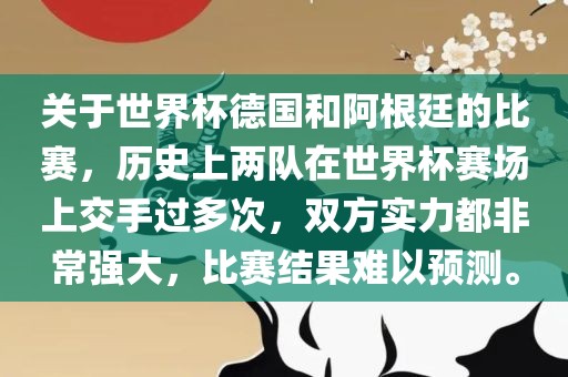 关于世界杯德国和阿根廷的比赛,历史上两队在世界杯赛场上交手过多次,双方实力都非常强大,比赛结果难以预测。