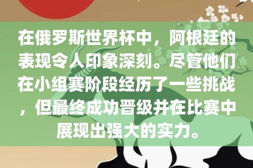 在俄罗斯世界杯中,阿根廷的表现令人印象深刻。尽管他们在小组赛阶段经历了一些挑战,但最终成功晋级并在比赛中展现出强大的实力。