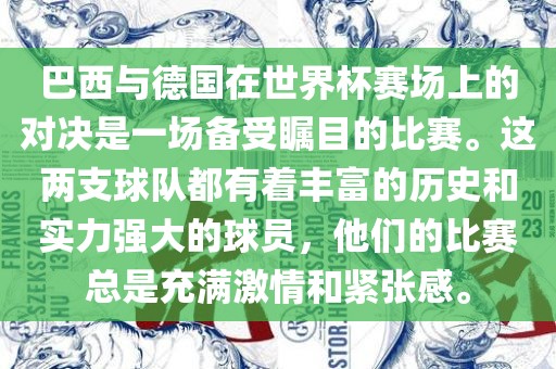 巴西与德国在世界杯赛场上的对决是一场备受瞩目的比赛。这两支球队都有着丰富的历史和实力强大的球员,他们的比赛总是充满激情和紧张感。