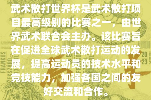武术散打世界杯是武术散打项目最高级别的比赛之一,由世界武术联合会主办。该比赛旨在促进全球武术散打运动的发展,提高运动员的技术水平和竞技能力,加强各国之间的友好交流和合作。