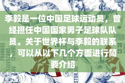 李毅是一位中国足球运动员,曾经担任中国国家男子足球队队员。关于世界杯与李毅的联系,可以从以下几个方面进行简要介绍
