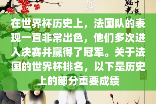 在世界杯历史上,法国队的表现一直非常出色,他们多次进入决赛并赢得了冠军。关于法国的世界杯排名,以下是历史上的部分重要成绩