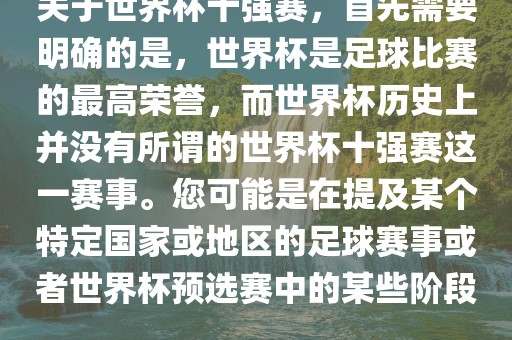 关于世界杯十强赛,首先需要明确的是,世界杯是足球比赛的最高荣誉,而世界杯历史上并没有所谓的世界杯十强赛这一赛事。您可能是在提及某个特定国家或地区的足球赛事或者世界杯预选赛中的某些阶段。