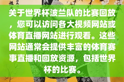 关于世界杯波兰队的比赛回放,您可以访问各大视频网站或体育直播网站进行观看。这些网站通常会提供丰富的体育赛事直播和回放资源,包括世界杯的比赛。