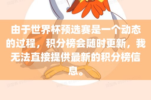 由于世界杯预选赛是一个动态的过程,积分榜会随时更新,我无法直接提供最新的积分榜信息。